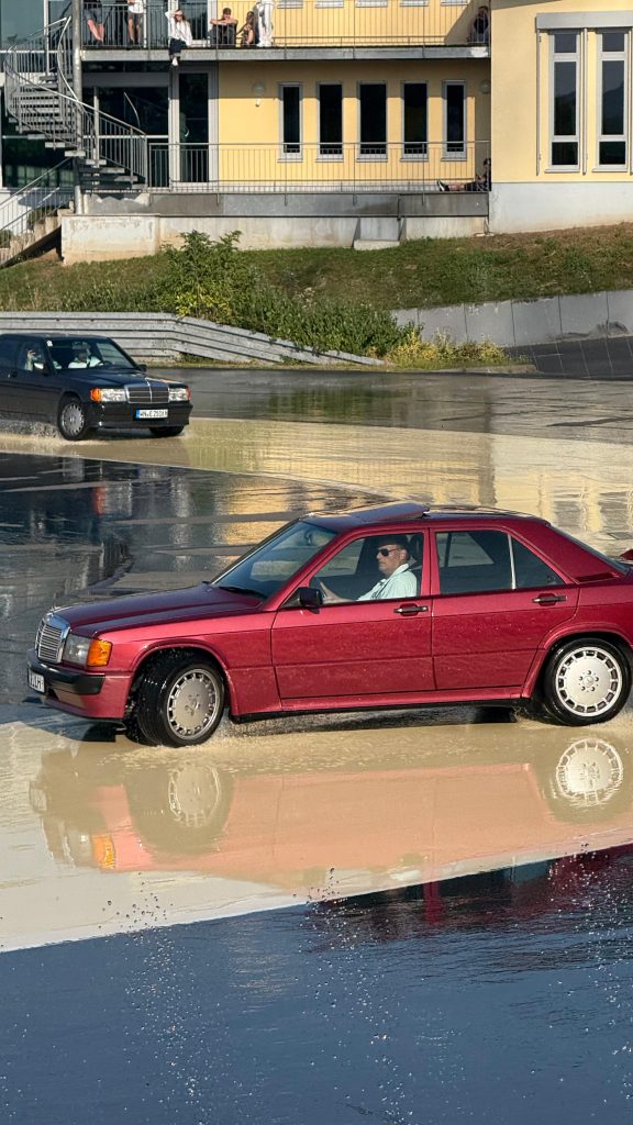 Darüber hinaus wurden wichtige Sicherheitsthemen wie die korrekte Sitzposition in älteren und modernen Fahrzeugen zur Minimierung von Verletzungen im Ernstfall behandelt. Auf der Glattfahrbahn zeigte der Trainer eindrucksvoll, wie bereits geringe Geschwindigkeitsunterschiede von nur 5 km/h zu drastischen Veränderungen im Fahr- und Bremsverhalten führen können und das man mit der Schätzung des eigenen Bremsweges meist daneben liegt.